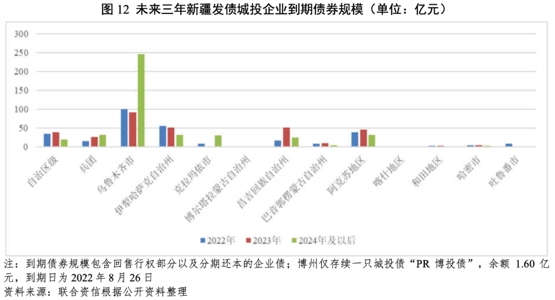 從新疆發債城投企業未來三年(2022-2024年)到期債券規模看,烏魯木齊市和伊犁州的發債城投企業未來三年集中到期債券規模較大,自治區級、兵團、阿克蘇地區和昌吉州發債城投企業到期債券規模一般,其他區域城投企業到期債券規模較小。