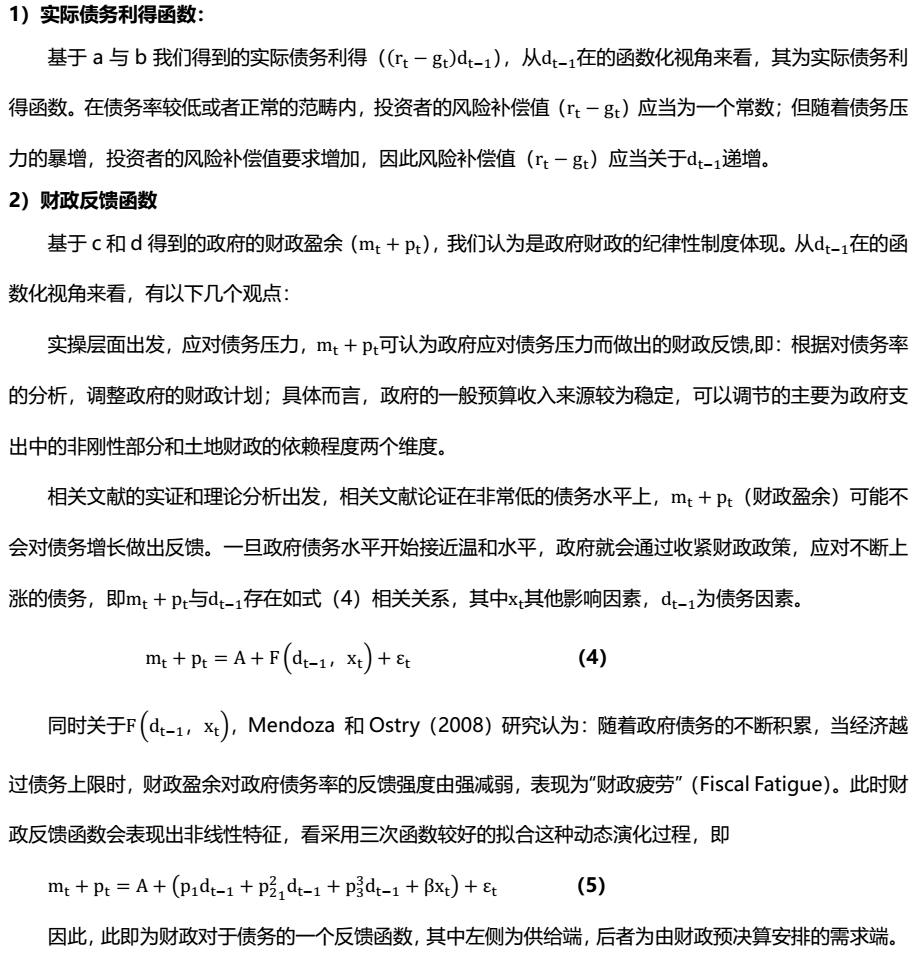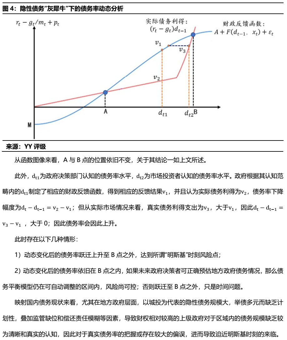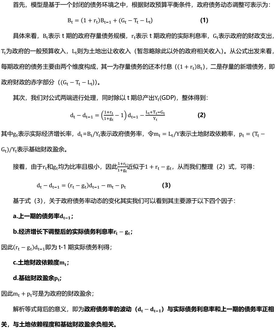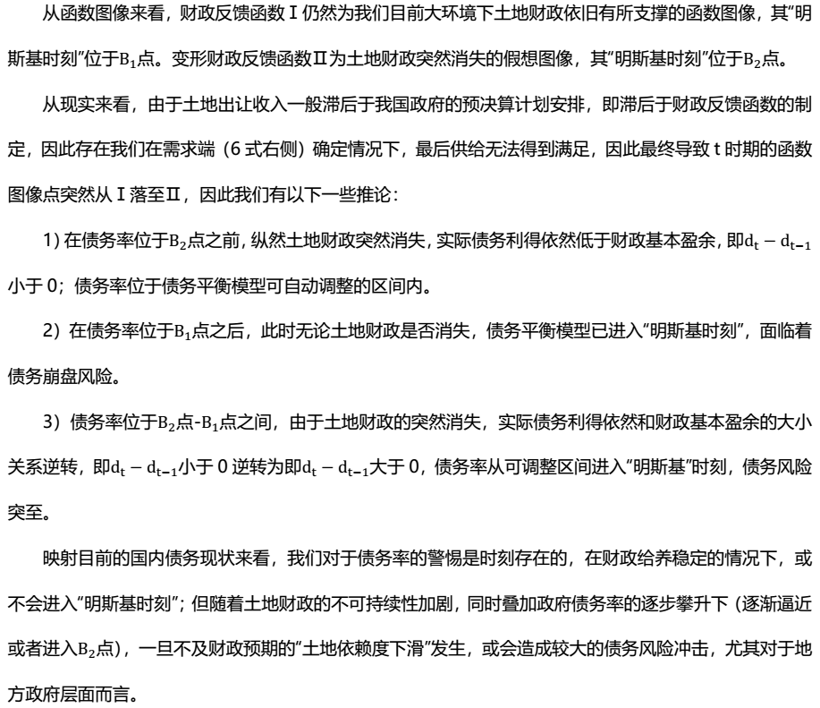 具體來看,我們從財政平衡模型出發,構造出實際債務利得函數和財政反饋函數,兩者動態變化下推演債務率的一個動態變化過程,點出城投和債務“明斯基時刻”存在的必然性和具體情形。