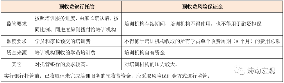 雖然預收費銀行托管與預收費風險保證金均是監(jiān)管方式,目的是為了保障學員和家長的資金安全,但二者之間還是有不小的差異,如資金來源差異較大、額度與監(jiān)管要求不同等等。