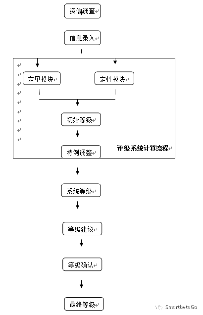 評級系統(tǒng)首先進行定性模塊和定量模型的計算,得到出事違約概率和信用等級,進一步按照特例調(diào)整的計算規(guī)則,得到系統(tǒng)評級和對應(yīng)違約概率。