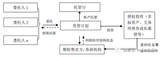 產品投向為債權+期權,所投債權的種類包括非標資產、交易所債券或私募債等品種,其目的主要在于通過非標或債券投資取得基礎收益,以收益互換形式與券商交易期權產品,并將收益與某種投資品種進行掛鉤,產品到期收益只和掛鉤標的資產價格相關,與人為實際投資結果的好壞無關,在保證最大虧損的前提下,把投資者的市場觀點精確地轉化為投資收益。