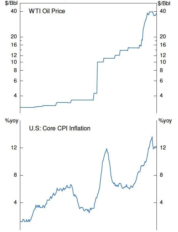 一般來說,“突變”狀態(tài)多來自于“供給端”和“外生沖擊”。比如1973年中東石油危機(jī)期間,國際油價從4美元/桶一年之內(nèi)上漲至10美元/桶,之后數(shù)年上漲至40美元/桶,對推升核心通脹等產(chǎn)生了巨大的影響(圖3)。其他的外部沖擊可能包括: