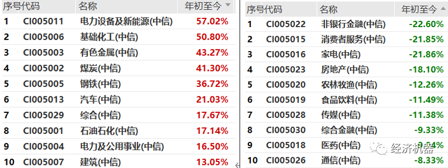 圖2、中信一級行業(yè):漲幅前十和跌幅前十