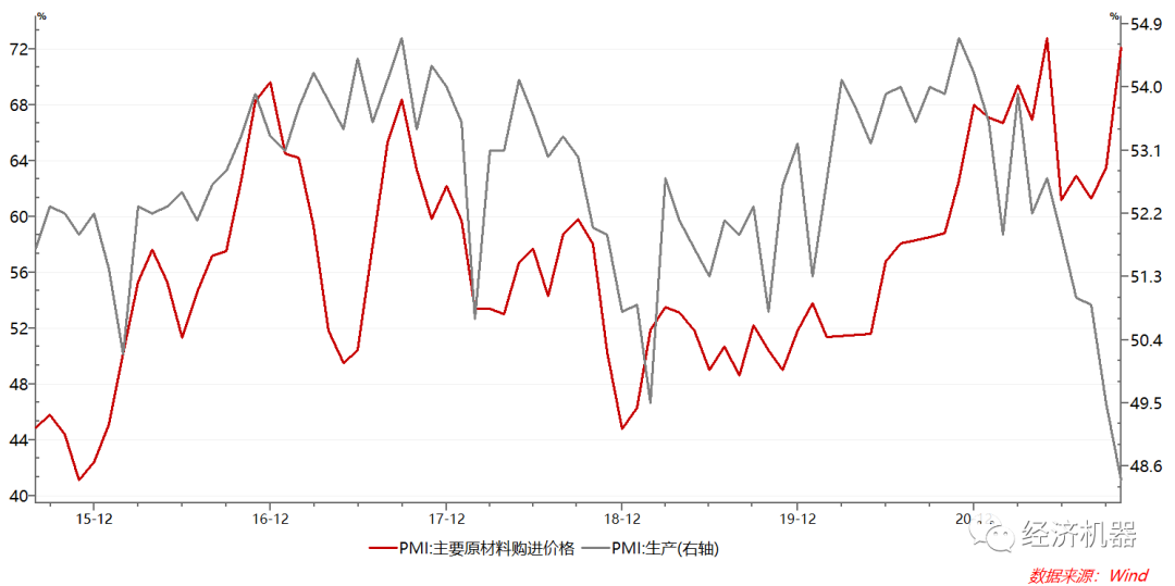 上周,官方PMI公布,制造業(yè)PMI為49.2,連續(xù)2個月低于50分界線以下,連續(xù)7個月出現(xiàn)放緩。分項(xiàng)中,生產(chǎn)、訂單等“量”相關(guān)的指標(biāo)繼續(xù)下滑,而原材料價格等“價”相關(guān)的指標(biāo)大幅攀升,過去一段時間以來兩者持續(xù)分化的趨勢達(dá)到了一個新的水平。