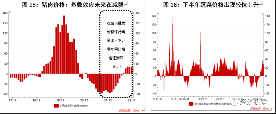 食品通脹方面,豬肉價格似乎已經(jīng)觸底,何時反彈雖然不確定,但其對CPI的拖累作用,明年下半年起將會消失(圖15)。蔬菜方面,近期由于北方洪澇災(zāi)害,價格出現(xiàn)明顯升高(圖16)。預(yù)計(jì)這波蔬菜價格上漲至少將持續(xù)至春節(jié)。此外,近期一些食品飲料類的上市公司,紛紛公布漲價方案,比如海天醬油,恒順醋業(yè)、金龍魚等,都表明PPI向CPI傳導(dǎo)加快,這些效應(yīng)會在明年上半年集中顯現(xiàn)。