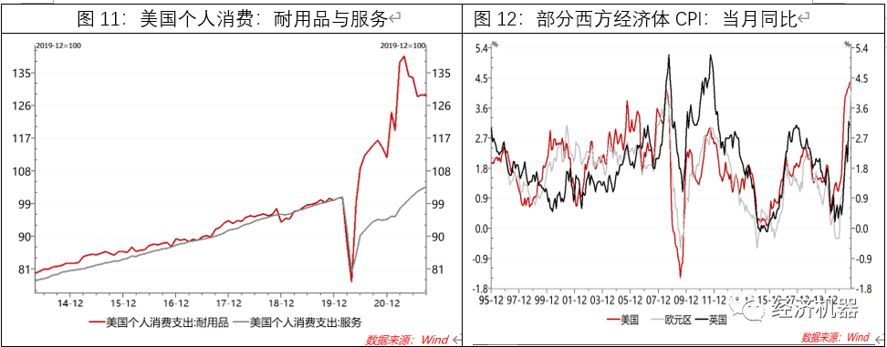 海外需求沖擊帶來的輸入性通脹。疫情期間,以美國為首的西方國家推出了大力度的財政刺激措施,包括向民眾派發(fā)現(xiàn)金,導(dǎo)致居民儲蓄率和購買力大幅提高。隨著疫苗接種,需求領(lǐng)先于供給而恢復(fù),耐用消費(fèi)品需求更是出現(xiàn)“井噴”,速度遠(yuǎn)快于服務(wù)消費(fèi)(圖11),加劇了其國內(nèi)的大通脹(圖12)。由于耐用品多屬于貿(mào)易品,通過國際貿(mào)易形式,向我國輸入了通脹壓力。