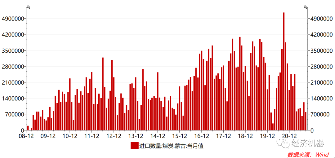 圖10:2021年蒙古煤炭進(jìn)口:過于嚴(yán)厲的通關(guān)政策下持續(xù)下滑