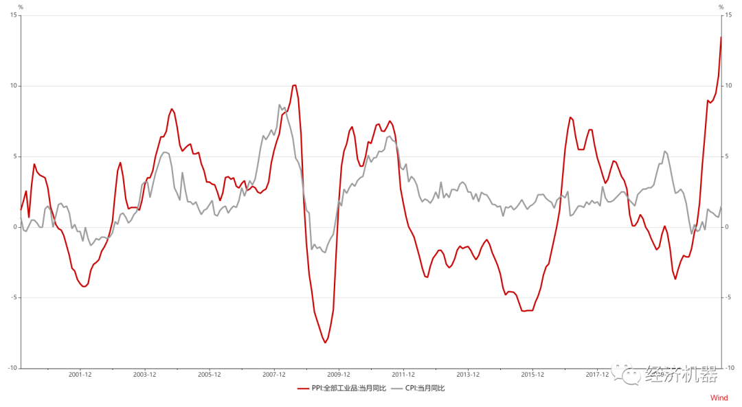 今日,10月通脹數(shù)據(jù)出爐,CPI、PPI均超預(yù)期上漲。其中,CPI受近期食品(豬肉、蔬菜等)價格上漲帶動,加速上行,同比上漲1.5%,預(yù)期1.3%,較前值提升0.9個百分點(diǎn);PPI則受大宗商品漲價影響,同比繼續(xù)大幅上行至13.5%,預(yù)期12%,連續(xù)3月創(chuàng)有記錄以來歷史新高。