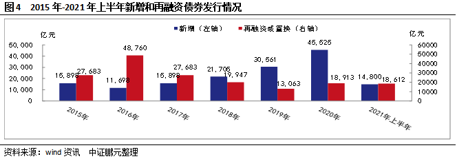 2021年上半年,受到專項債券發行進度放緩的影響,新增債券規模大幅下降;在新增債券規模下降之下,再融資債券規模大幅上升,這既是地方財政緩解借新還舊壓力的需要,也反映出專項債券償還機制不健全、不成熟。上半年,新增債券發行427只,同比下降53.69%,發行規模14,799.81億元,同比下降46.89%,其中新增一般債券4,656.46億元,新增專項債券10,143.34億元;再融資債券發行228只,同比上升132.65%,發行規模18,611.63億元,同比上升166.05%,其中再融資一般債券11,446.79億元,再融資專項債券7,164.85億元。2021年新增一般債券限額為8,000億元,上半年完成一般債券新增額度的58.21%,新增專項債券限額為34,676億元,上半年完成專項債券新增額度的29.25%。2021年地方債到期償還規模為26,659.36億元,同比上升28.50%,上半年再融資債券占全年到期償還額之比為69.81%。
