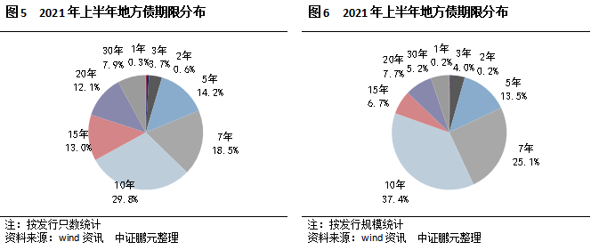 1、上半年發行利率整體有所下行。2021年上半年地方債發行利率在2.59%到3.98%之間,平均發行利率為3.48%,較2020年下半年3.59%的平均發行利率下行超過11BP,主要是受地方債期限縮短因素的影響。具體來看,3年期為3.04%,下行5BP;5年期為3.23%,上行5BP;7年期為3.37%,下行1BP;10年期為3.4%,上行6BP;15年期為3.72%,下行5BP;20年期為3.84%,下行6BP;30年期為3.88%,下行16BP。