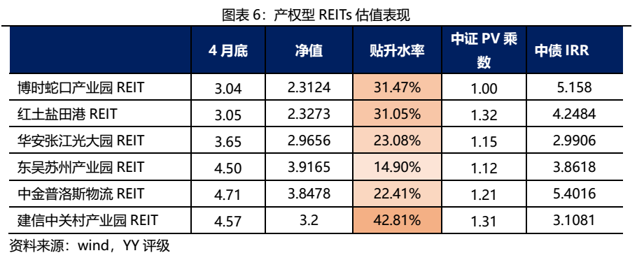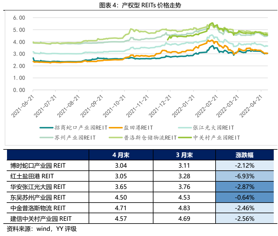 四月中上旬產(chǎn)權(quán)型REITs整體上揚,中下旬回調(diào)明顯,整體呈下跌走勢。其中紅土鹽田港REIT月底收盤價為3.05元,相比于3月底下跌6.93%,跌幅最大;跌幅最小的是東吳蘇州產(chǎn)業(yè)園REIT,4月最后一個交易日收于4.5元,相比于3月底下跌0.64%。