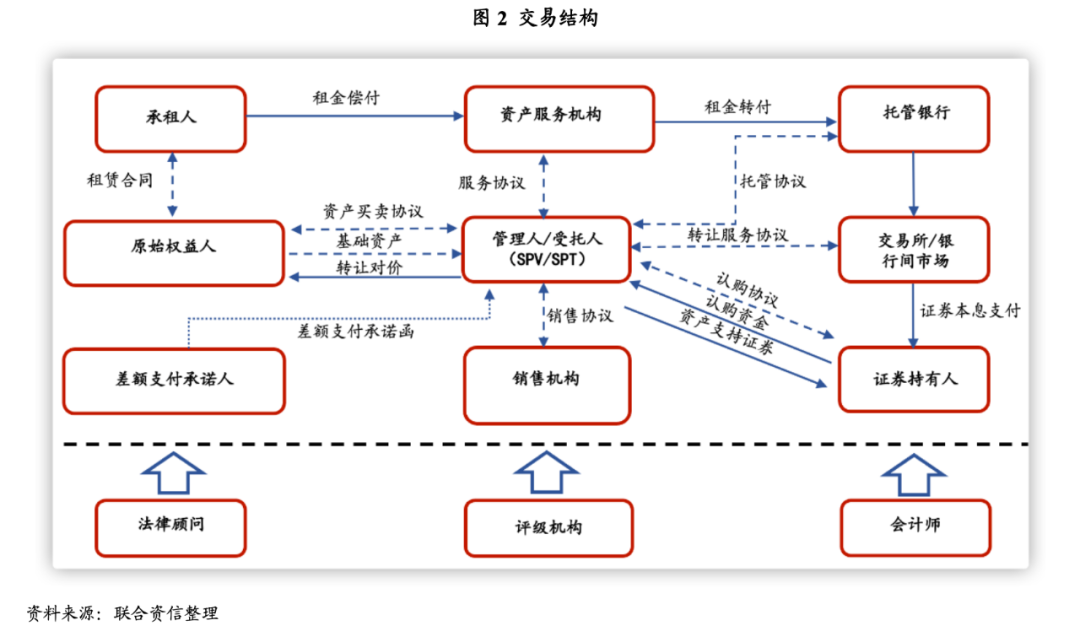在常見的融資租賃資產(chǎn)支持證券的交易結(jié)構(gòu)中,一般由管理人/受托人設(shè)立特殊目的載體(SPV/SPT),管理人/受托人收到募集資金后,用于向原始權(quán)益人購買租賃債權(quán)資產(chǎn),再以租賃債權(quán)資產(chǎn)形成的本息收益按交易結(jié)構(gòu)的約定向資產(chǎn)支持證券持有人還本付息。融資租賃債權(quán)資產(chǎn)支持證券一般交易結(jié)構(gòu)如上圖所示。一般而言,原始權(quán)益人會繼續(xù)承擔資產(chǎn)服務(wù)機構(gòu)的角色,對屬于SPV/SPT的基礎(chǔ)資產(chǎn)現(xiàn)金流回款進行歸集、轉(zhuǎn)付、催收以及違約基礎(chǔ)資產(chǎn)租賃物的處置。