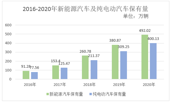 新能源汽車保有量達492萬輛。截至2020年底,全國新能源汽車保有量達492萬輛,占汽車總量的1.75%,比2019年增加111萬輛,增長29.18%。其中,純電動汽車保有量400萬輛,占新能源汽車總量的81.32%。新能源汽車增量連續(xù)三年超過100萬輛,呈持續(xù)高速增長趨勢。