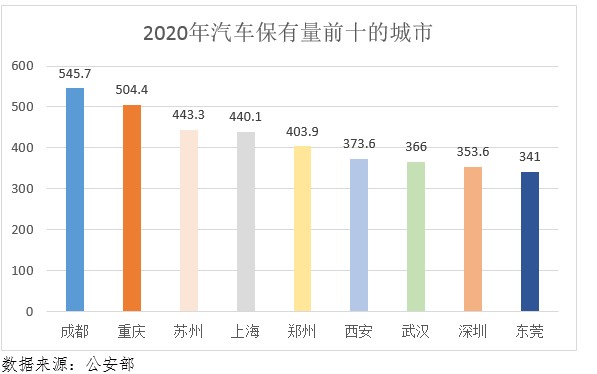 全國有70個城市的汽車保有量超過百萬輛,同比增加4個城市,31個城市超200萬輛,13個城市超300萬輛,其中北京、成都、重慶超過500萬輛,蘇州、上海、鄭州超過400萬輛,西安、武漢、深圳、東莞、天津、青島、石家莊等7個城市超過300萬輛。
