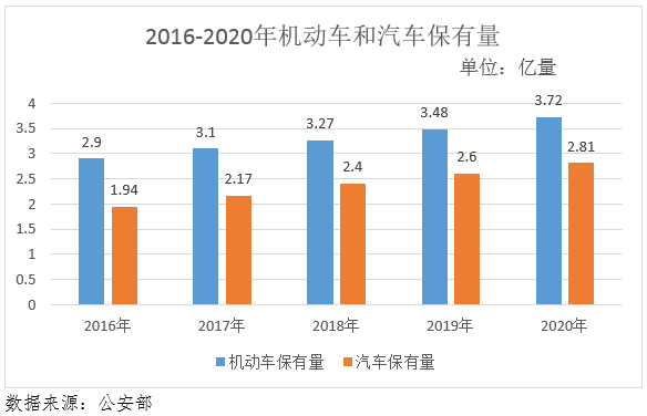 公安部統(tǒng)計數(shù)據(jù)顯示,2020年全國機動車保有量達3.72億量,其中汽車2.81億量。2020年全國新注冊登記機動車3328萬輛,新領(lǐng)證駕駛?cè)?231萬人。
