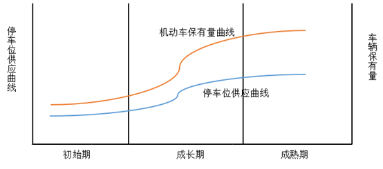 居民消費水平的提高拉動了汽車消費,而汽車保有量的持續(xù)提高促進了停車設施需求的擴大。機動車保有量與停車泊位在不同發(fā)展時期的關(guān)系如下圖所示: