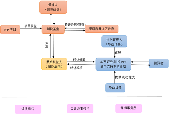 此項所涉及基礎資產(chǎn)為資陽市雁江區(qū)停車場PPP項目經(jīng)營權(quán),資陽市雁江區(qū)停車場PPP項目總投資3.09億元,合作期限12年,采用TOT模式運營。城東新區(qū)管委會通過簽訂PPP項目合同及其他相關(guān)法律文件將雁江區(qū)停車場PPP項目的特許經(jīng)營權(quán)轉(zhuǎn)讓于私募基金(川投航信天泰2號私募投資基金),履行運營維護義務,并享受相應收益。
