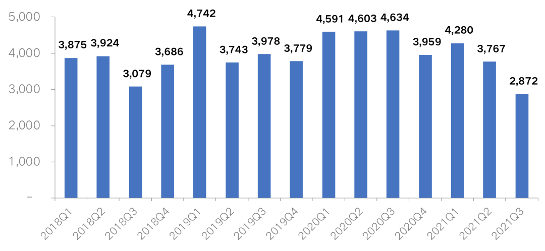 據不完全統計,2021年前9月100家典型房企的融資量為10919億元,同比下降21%。其中,第三季度的融資額為2872億元,同比下降38%,環比下降24%,融資額創2018年以來的最低水平。