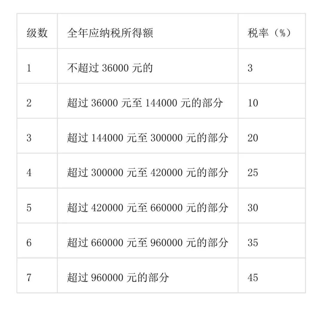 (注1:本表所稱全年應納稅所得額是指依照本法第六條的規定,居民個人取得綜合所得以每一納稅年度收入額減除費用六萬元以及專項扣除、專項附加扣除和依法確定的其他扣除后的余額。注2:非居民個人取得工資、薪金所得,勞務報酬所得,稿酬所得和特許權使用費所得,依照本表按月換算后計算應納稅額。)