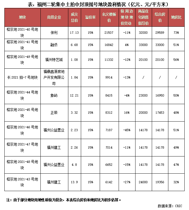 而就盈利情況來看,整體較為可觀。按照綜合指標(biāo)銷售價(jià)來看,除本次土拍最熱門的地塊晉安區(qū)紅光村及周邊地塊(榕宗地2021-40號(hào)地塊)外,其余9宗封頂成交地塊地房比均在60%以下,尤其是福州建工競(jìng)得的三江口地塊,地房比僅有32%,房地差過萬(wàn)元,盈利空間均十分可觀。