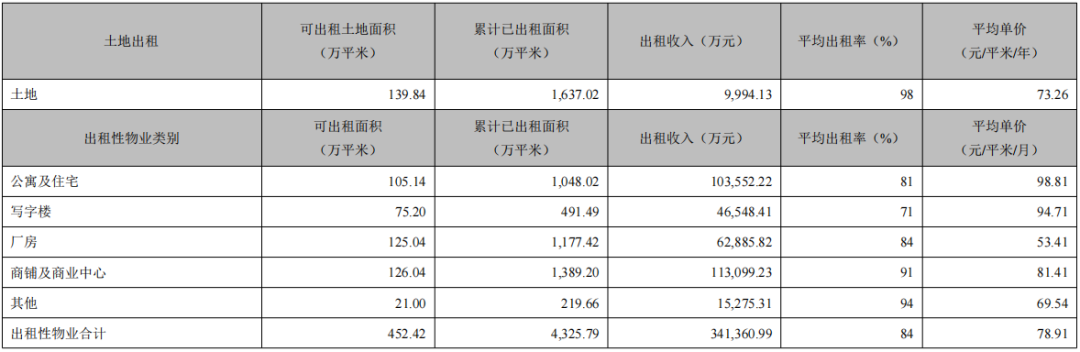 招商蛇口擁有的可出租物業總可出租面積 452.42萬平米,包含公寓、住宅、別墅、寫字樓、廠房、商鋪及商業中心等多種業態。報告期內,公司實現出租收入34.14億元,同比增加 17.98%,總體出租率84%。