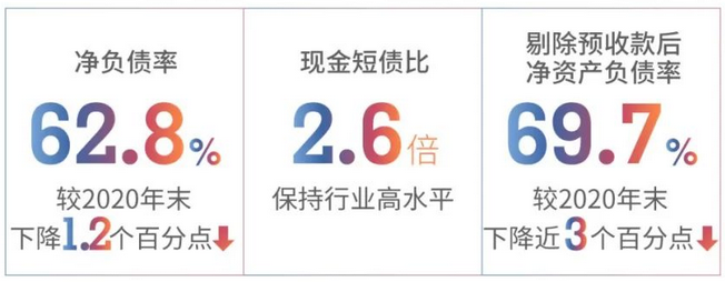 報告期間內,截至2021年末,碧桂園總有息負債下降至3179.2億元,凈負債率45.4%,同比優化10.2個百分點。凈負債率、現金短債比均優于“三道紅線”要求,且處在行業較優水平,剔除預收賬款的資產負債率也從2020年底的80%下降至74%。
