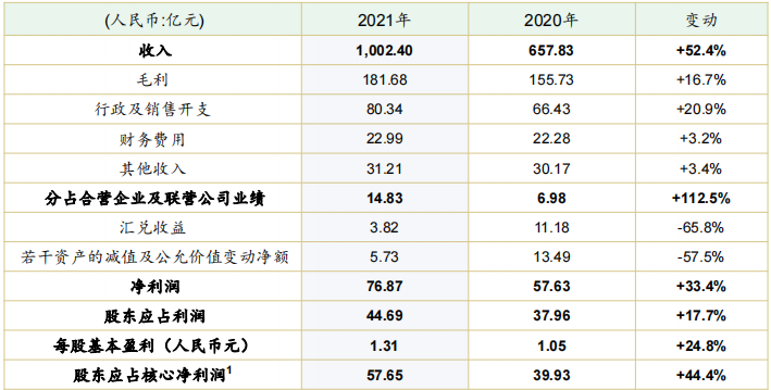 報告期間內,營業收入達到1002億元,同比增長52.4%;年內利潤76.87億元,較去年增長33.4%;核心凈利潤57.65億元,同比增長44.4%;每股盈利達到1.31億元,同比增長24.8%。