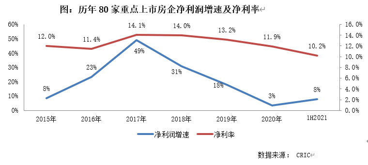 發展空間受限也體現在了房企歷年的利潤表現上,房地產行業正面臨利潤增長緩慢,利潤率下滑的趨勢。2020年80家重點上市房企的凈利潤增速僅為3%,較2019年增速下降了15個百分點。此外2020年凈利潤率11.9%較2019年下降了1.3個百分點;2021年上半年繼續下降至10.2%。