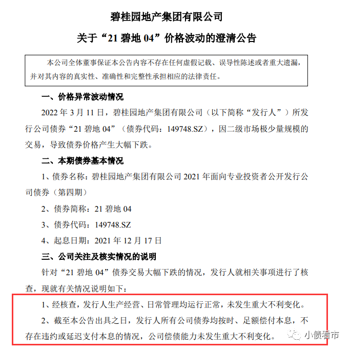 公告顯示,碧桂園地產發(fā)行的“21碧地04”,因二級市場極少量規(guī)模的交易,導致債券價格產生大幅下跌。