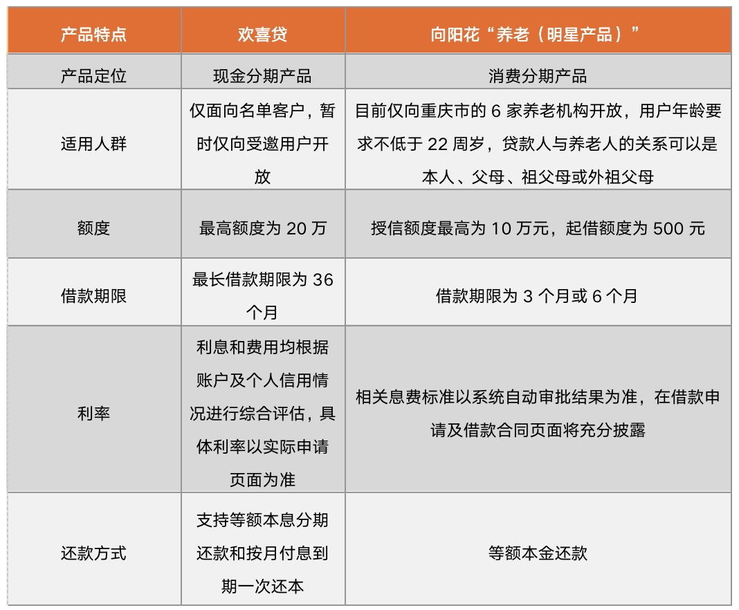 根據陽光消費金融官方顯示,該產品是為養老人與養老機構訂立的養老合同申請分期,貸款人與養老人的關系可以是本人、父母、祖父母或外祖父母。用戶年齡要求不低于22周歲,授信額度最高為10萬元,起借額度為500元,借款期限為3個月或6個月,還款方式為等額本金還款。