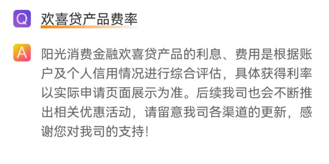 此前2021年3月31日,央行發布公告要求所有貸款平臺公示利率,而陽光消費金融在“歡喜貸”的產品信息展示上,未能按要求公示利率。截至11月初,陽光消費金融針對該公告,仍未采取措施或做出相關回復。