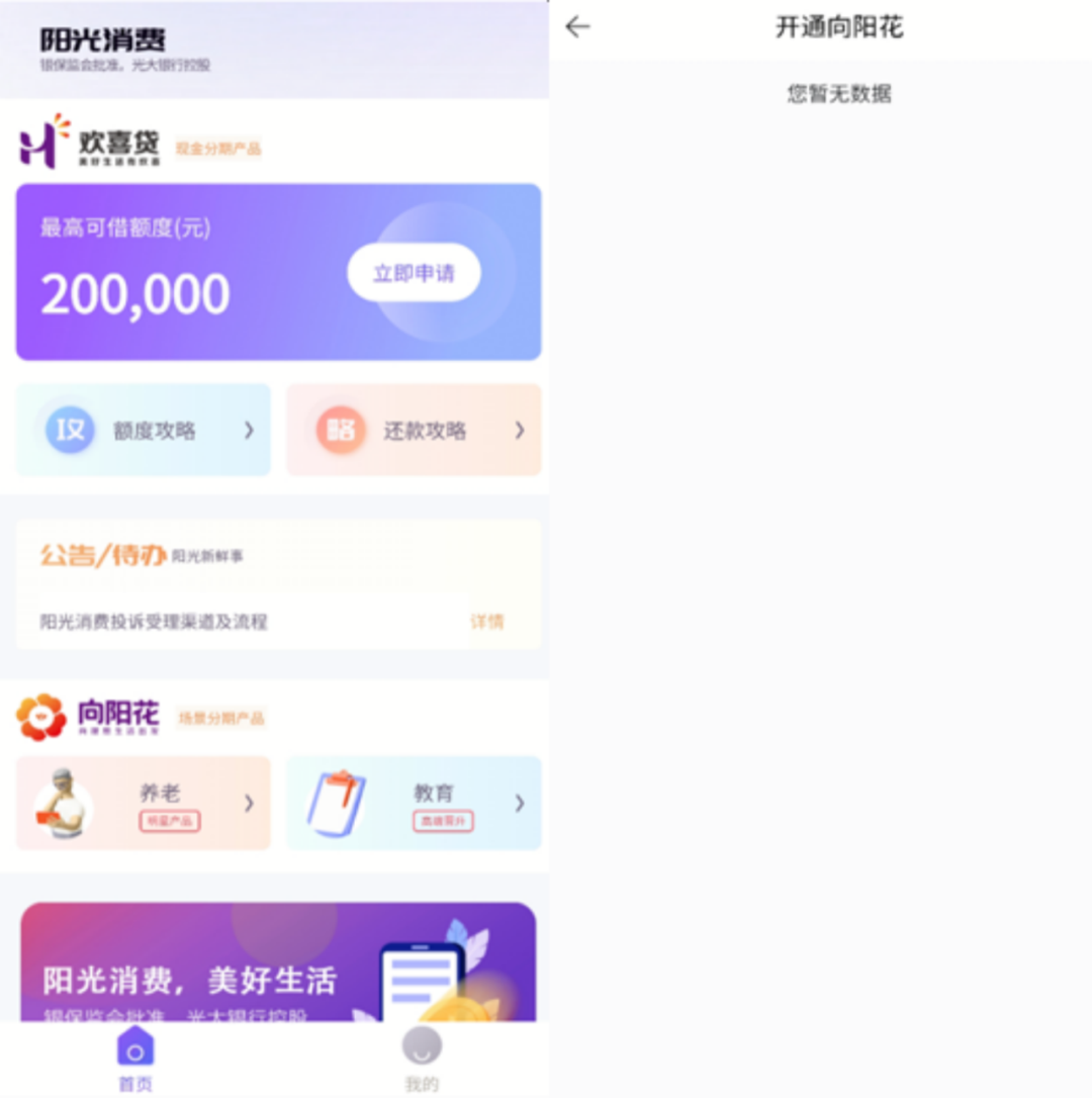 截至2021年11月,陽光消費金融僅有兩款產品:第一款是平臺開業初期便推出的現金分期產品“歡喜貸”;第二款是2021年5月推出的場景消費分期產品“向陽花”,該品類下還包括“養老(明星產品)”與“教育(高端晉升)”兩種產品。