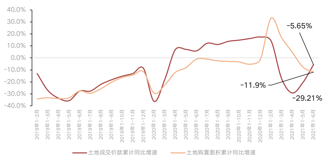 2021年6月末22個核心城市首輪集中供地陸續結束,因此在核心城市土拍的促進下全國土地成交價款顯著上升,并成為開發投資額部分支撐。但由于房企多將拿地重心優先聚焦于核心城市,因此全國整體土地購置面積繼續保持低位,相較往年降幅一再擴大。