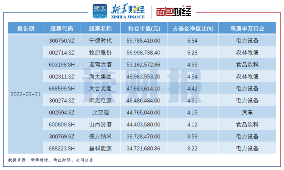 2022年一季報顯示,招商興和優(yōu)選的前十大持倉中,五只股票屬于申萬電力設(shè)備行業(yè),包括寧德時代、天合光能、陽光電源、德方納米以及晶科能源,這些公司均屬于新能源汽車、光伏產(chǎn)業(yè)鏈。除了這5家企業(yè),該基金前十大持倉中還包括新能源車企比亞迪。
