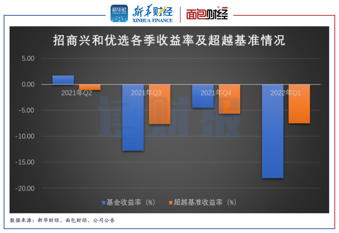 2021年二季度以來的完整四個季度,招商興和優(yōu)選僅在2021年二季度獲得正收益,其余三個季度均錄得虧損。更為重要的是,這四個季度該基金均未跑贏業(yè)績比較基準(zhǔn)。