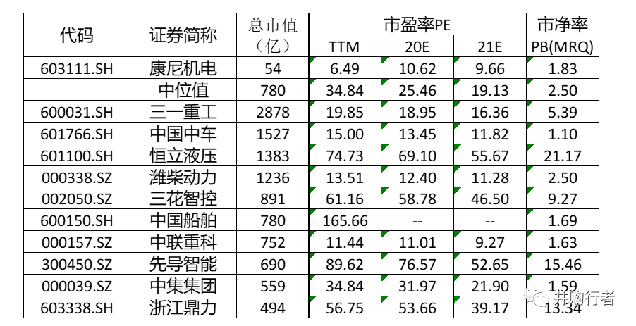 可比機械行業的企業估值比較: