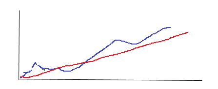 小編舉個簡單的例子,下圖紅線代表攤余成本估值的凈值走勢,藍線代表市值法的凈值走勢,紅線代表的波動率不就是投資者夢寐以求的嗎,也難怪是沖規(guī)模“利器”。
