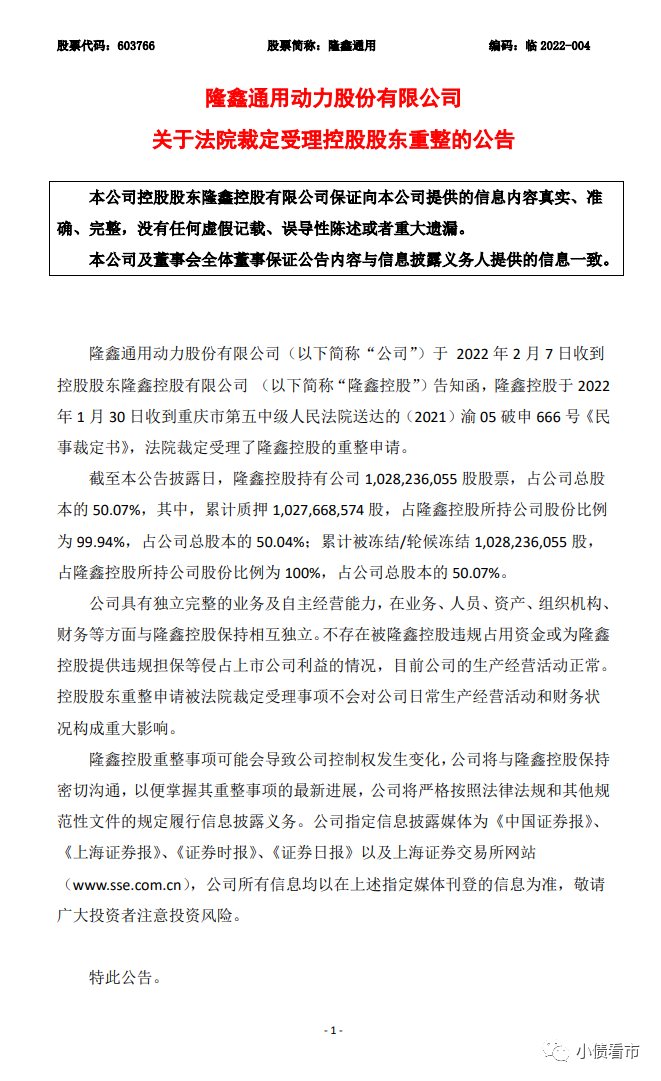 隨后,隆鑫通用(603766.SH)也公告稱,控股股東隆鑫控股收到重慶市第五中級人民法院送達的(2021)渝 05 破申 666 號《民事裁定書》,法院裁定受理其重整申請。