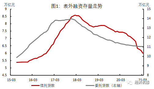 第一季度新增社會融資總額中,人民幣貸款占比達到77.3%,同比高12個百分點。作為表外融資,委托貸款和信托貸款第一季度凈減少3619元,比上年同期多減少4359億元。從兩者存量同比增速看,3月份分別同比下降2.8%和19.2%,總量均呈繼續下降趨勢(圖1),表明壓縮表外融資的大趨勢仍在繼續。第一季度直接融資(企業債券+股票+政府債券+ABS)合計新增17938億元,較上年同期大幅下降16659億元,主要與地方專項債發行節奏相對放緩和縮減有關。