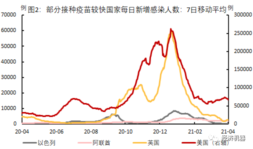 經濟復蘇勢頭強勁,既與“就地過年”、復工復產較快有關,也與國內外疫情持續改善有關。過去一段時間,各國開始進入疫苗接種階段。海外國家中,美國、以色列、阿聯酋、英國等疫苗接種最為迅速,感染人數也出現了明顯的下降態勢(見圖2)。疫情改善帶動了海外經濟的復蘇,對我國外需產生明顯拉動作用。年初以來,美、德、日、韓等主要經濟體進口增速同比均已轉正,大部分已出現兩位數正增長。此外,美國近期通過了1.9萬億美元的刺激法案,也將強化我國外需復蘇的持續性。疫情改善疊加經濟刺激,國際組織持續向上修正對美國及海外國家2021年經濟增速預測,2021年我國外貿大環境整體上仍將處于有利狀態。