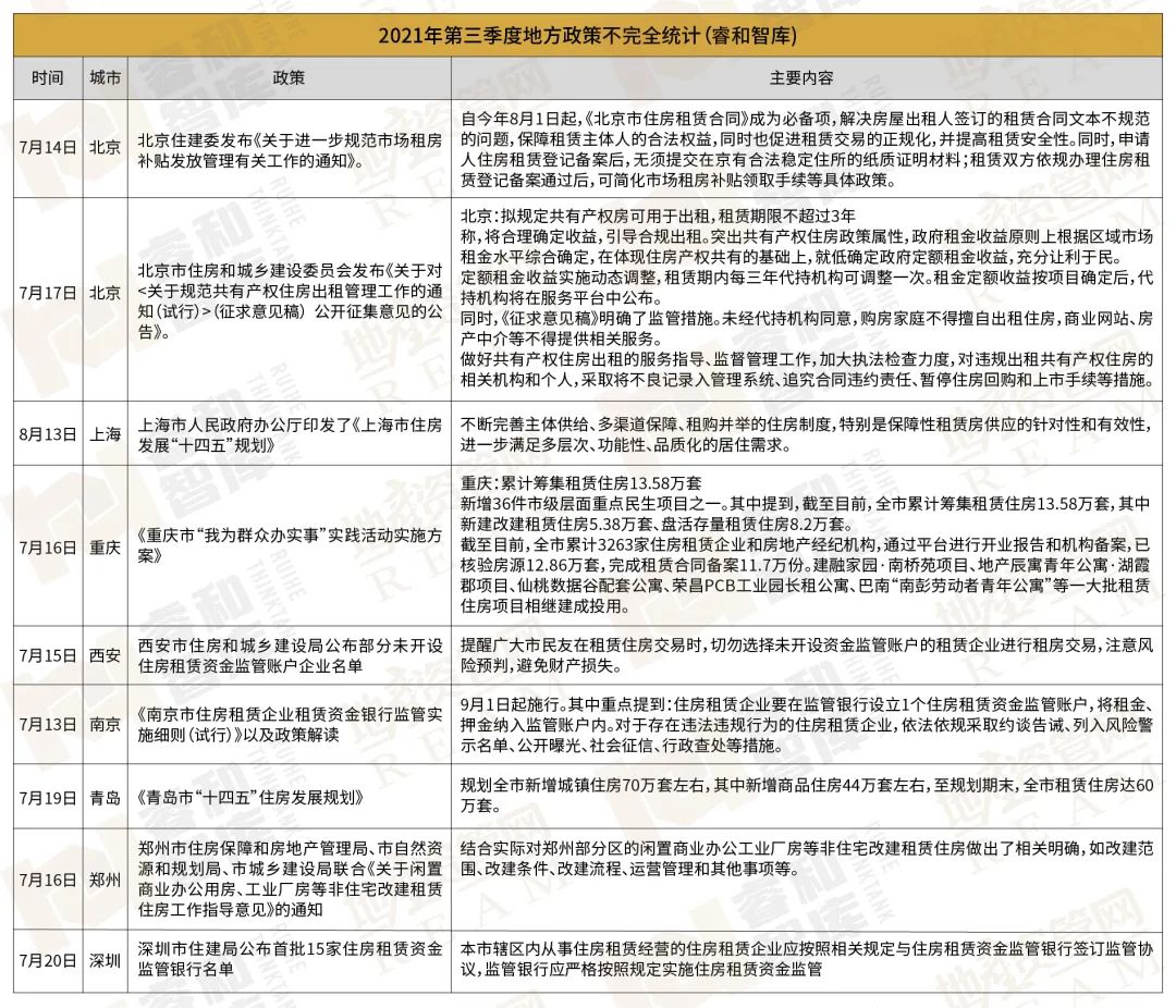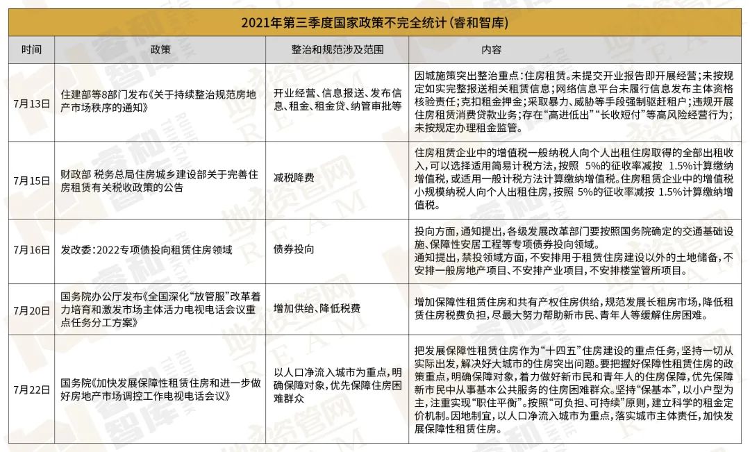黨的“十九大”報告明確提出要加快建立多主體供給、多渠道保障、租購并舉的住房制度。2021年以來,土地、稅費等多維度利好政策頻頻推出。睿和智庫以2021年第三季度為周期進行了部分梳理。