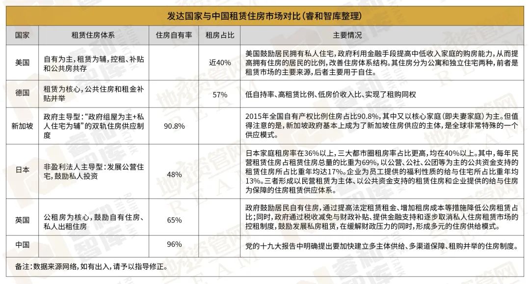 美國、德國、日本、新加坡、英國等發達國家都擁有比較成熟發達的住房租賃市場和完善的住房租賃政策。租賃是住房供應的“雙引擎”之一,一般占據40%~60%的市場份額。其中,新加坡供應模式非常特殊,政府基本上成為了住房供應的主體。