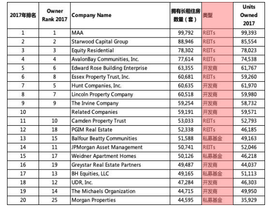 從模式看,數據顯示,美國2017年擁有長租住房數量排名前20的住房租賃企業具有以下特點:住房租賃企業以REITs和開發商為主, 前20的企業均為重資產運營商。