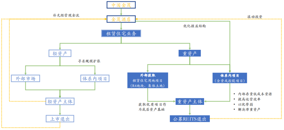 如何輕重結合?以金茂為例,公寓業態優先尋求規模擴張,夯實底層重資產基礎,并在形成現金流的基礎上,提升體系內滯重資產的運營效率,并將滿足條件的體系內自持部分裝入重資產主體,構建公募REITs底層資產, 打通投融管退全生命周期。