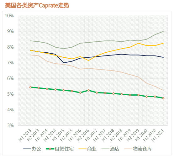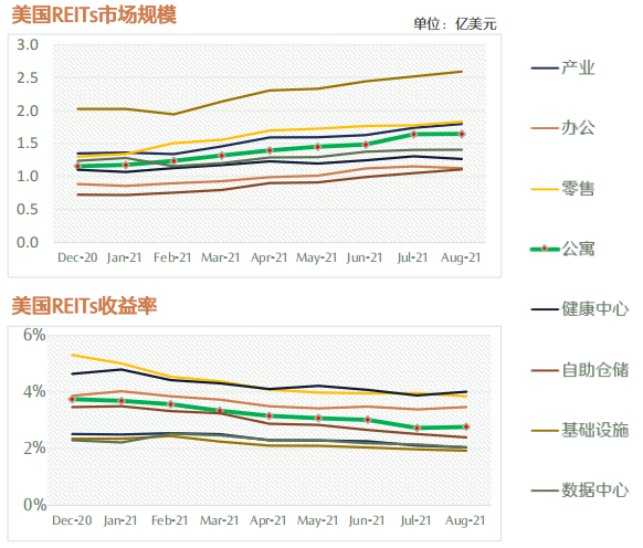 從2013年至今美國各類資產資本化率走勢來看,單看美國REITs市場規模和收益率走勢,除了IDC、物流資產之外,投資人對長租公寓的投資一直處于上升趨勢。