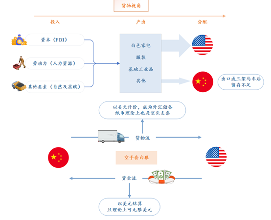 淺層看,中美貿(mào)易摩擦是貿(mào)易順差引發(fā)的世界間資本-貨物的流動失衡;美國作為消費者,我們承擔(dān)生產(chǎn)者:而以美元計價的內(nèi)在矛盾是,美國本質(zhì)上是獲利更大一方