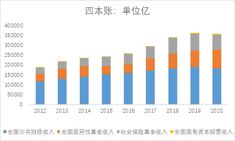 從財政結(jié)構(gòu)來看,收入主要源于四本賬:一般公共預(yù)算收入,政府性基金收入,社會保險收入和國有資本經(jīng)營收入;其中社保收入和一般公共預(yù)算收入不能直接加總(兩者互有調(diào)劑,約2萬億附近),國有資本經(jīng)營收入規(guī)模偏低(千億體量)。