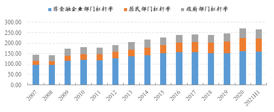 細(xì)分部門來看:居民部門在持續(xù)上升;但是最大的還是占比還是非金融企業(yè)部門;但是由于融資平臺這一馬甲存在,企業(yè)部門的杠桿率是顯著高估;而政府債務(wù)則可能低估。