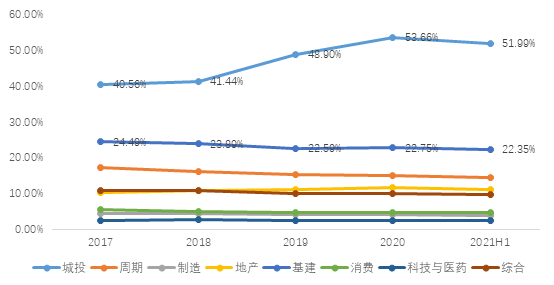 由于數(shù)據(jù)缺失,我們繼續(xù)缺失,通過發(fā)債主體(這里是以偏概全,數(shù)據(jù)會低估)針對行業(yè)大類拆分,可以來看細(xì)分行業(yè)的杠桿率攀升:假設(shè)隱性債務(wù)限定領(lǐng)域在融資平臺和基建投放上,兩者累計杠桿率到74%;而城投更多衡量的地方視角的債務(wù)、基建衡量的是中央層面的項目。
