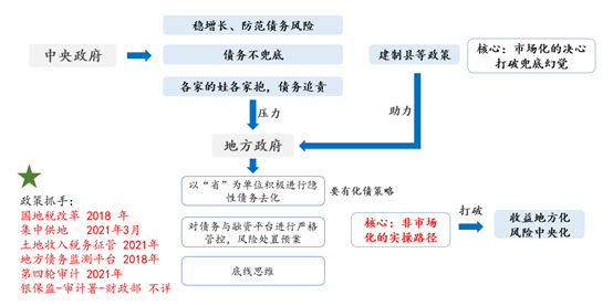 這一視角,央地的角力一直存在。所以地方上,為了發(fā)展而舉債,成為口號正確非常大的掩蓋;但是綜合我們第一部分的闡述:離開階段性、劑量談問題,是鏡中撈月。那站在現(xiàn)實背景下,我們清晰的浮出以下脈絡(luò):